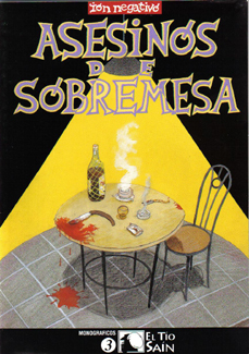 "Asesinos de sobremesa". Ión negativoEditado por: Asociación de Amigos del Tebeo de la Región de Murcia (AATRM)Monográfico nº 3 de "El Tío Saín", editado en 1996, recoge cuatro aventuras interrelacionadas, en las que se ofrece una visión cruda de una España sangrienta y oculta, llena de fanatismo, intolerancia, tramas políticas, traición e inocencia. Ión negativo, seudónimo de Juan Navarro, es autor de guión y dibujos. |