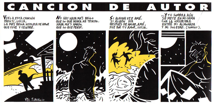 Lee los álbumes de la creación de Hergé y disfruta y aprende de la forma de narrar del dibujante belga, de su habilidad para inventar personajes secundarios, de su dominio del dibujo. En plena evolución e inquietud artística descubre a otro maestro de la historieta, esta vez americano, se trata de Will Eisner y de su "Spirit". Enseguida se convierte en fan acérrimo del detective enmascarado. Admira la plasticidad de los personajes a caballo entre el dibujo cómico y el realista, el trazo del pincel, el control absoluto del blanco y negro. A principios de los ochenta, estudia Bellas Artes en la Universidad de Valencia y allí toma contacto con compañeros y profesores amantes de la historieta. El ambiente valenciano propicia encuentros entre los que empiezan y los que ya son algo en el mundo del cómic; así, Tiburcio conoce a Sento (a la sazón profesor suyo en la Facultad ), se acerca a la obra de Micharmut, de Daniel Torres, de Mique Beltrán. El dibujante cartagenero empieza a publicar en revistas valencianas entre las que destaca "Marca Acme". Poco después envía sus trabajos a la revista "Madriz" coincidiendo con su vuelta a Murcia. La revista "Lean" será de las primeras que acoja sus trabajos en la capital del Segura. Más tarde, comenzará a diseñar folletos y carteles, una actividad que continúa realizando, para distintas concejalías locales sin perder de vista la historieta. A mediados de los ochenta conoce a Juan Álvarez y juntos crearán el personaje "Pacheco y los africanos" para la revista "Esta Región". En plena efervescencia del Concurso Murcia Joven, es nombrado coordinador del mismo, en el apartado de cómic, junto a José Manuel Campillo. En 1990, de nuevo con Juan Álvarez, realiza tiras para "Diario 16" de Murcia. Poco después lo ficha "El Víbora", donde publicará una serie intimista. En 1994 coordina y colabora en los dos primeros números de "El Tío Saín" y se implica en la publicación de carácter cultural "Boca a Boca". En la actualidad es profesor de enseñanza secundaria y en sus ratos libres se dedica a la pintura. |